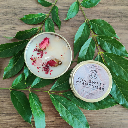 "The Sweet Harmonizer" Strawberry + Vanilla + Rose Quartz Crystal-infused Tin Candle