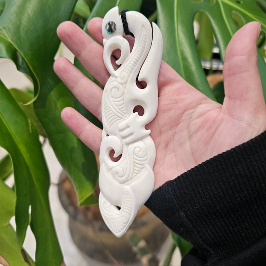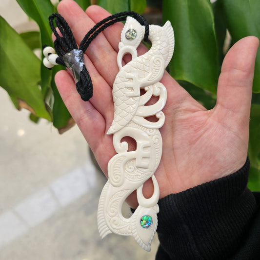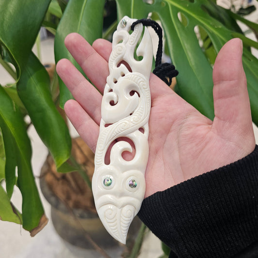 Handcarved Large Tiki Bone Carving Pendant with Paua