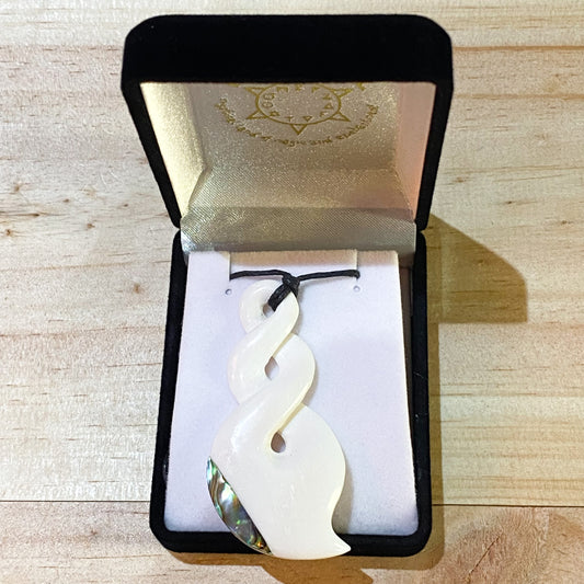 Handcarved Double Twist Bone Carving Pendant With Paua - Pikorua