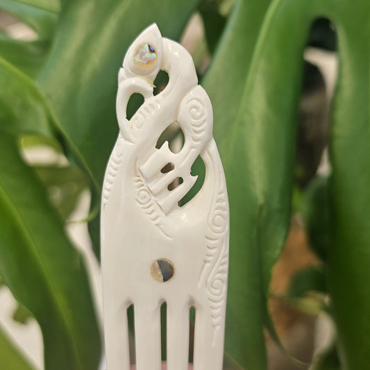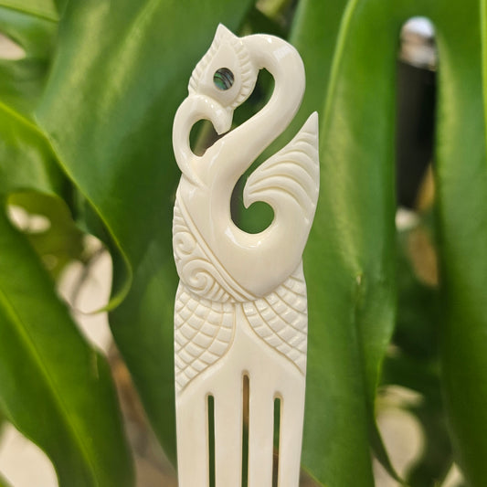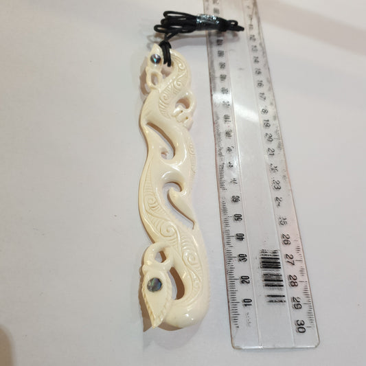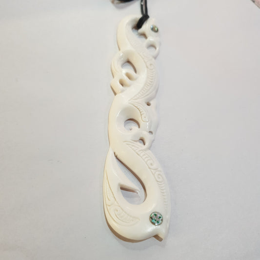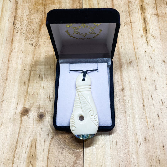 Handcarved Bone Carving Pendant w Paua Eye - Manaia