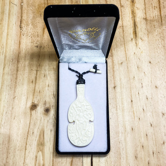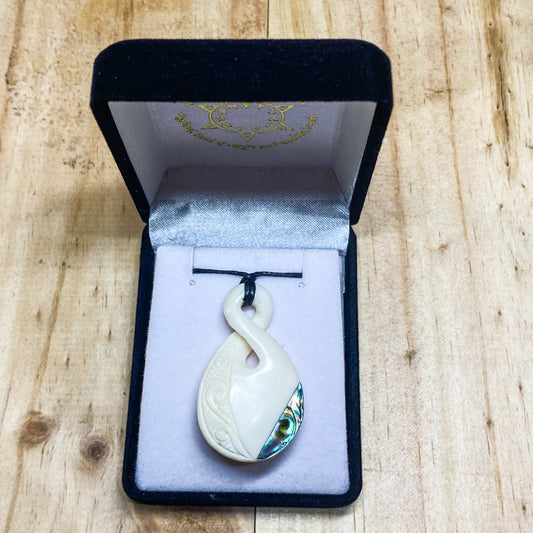 Handcarved Twist Bone Carving Pendant With Paua and Design - Pikorua