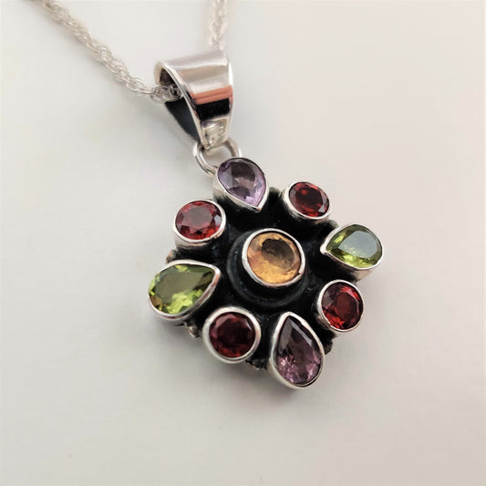 Peridot, Amethyst, Ruby and Citrine Flower 925 Sterling Silver Pendant