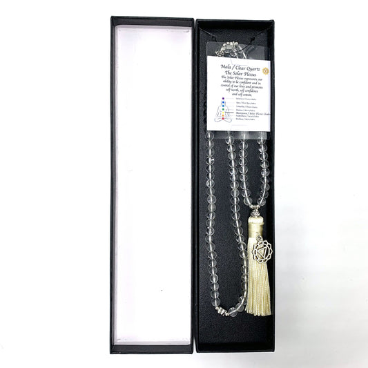 Clear Quartz Mala Beads with Solar Plexus Chakra Charm- 108 Beads