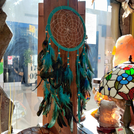Teal Peacock Feather Black Thread Dreamcatcher - "Zonta"
