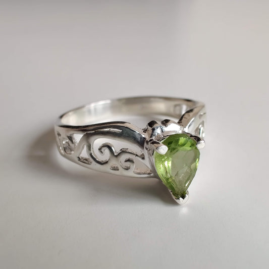 Peridot Tear Drop 925 Sterling Silver Ring with Koru Design