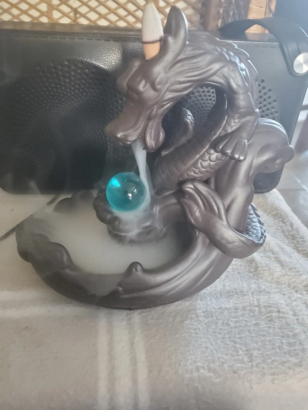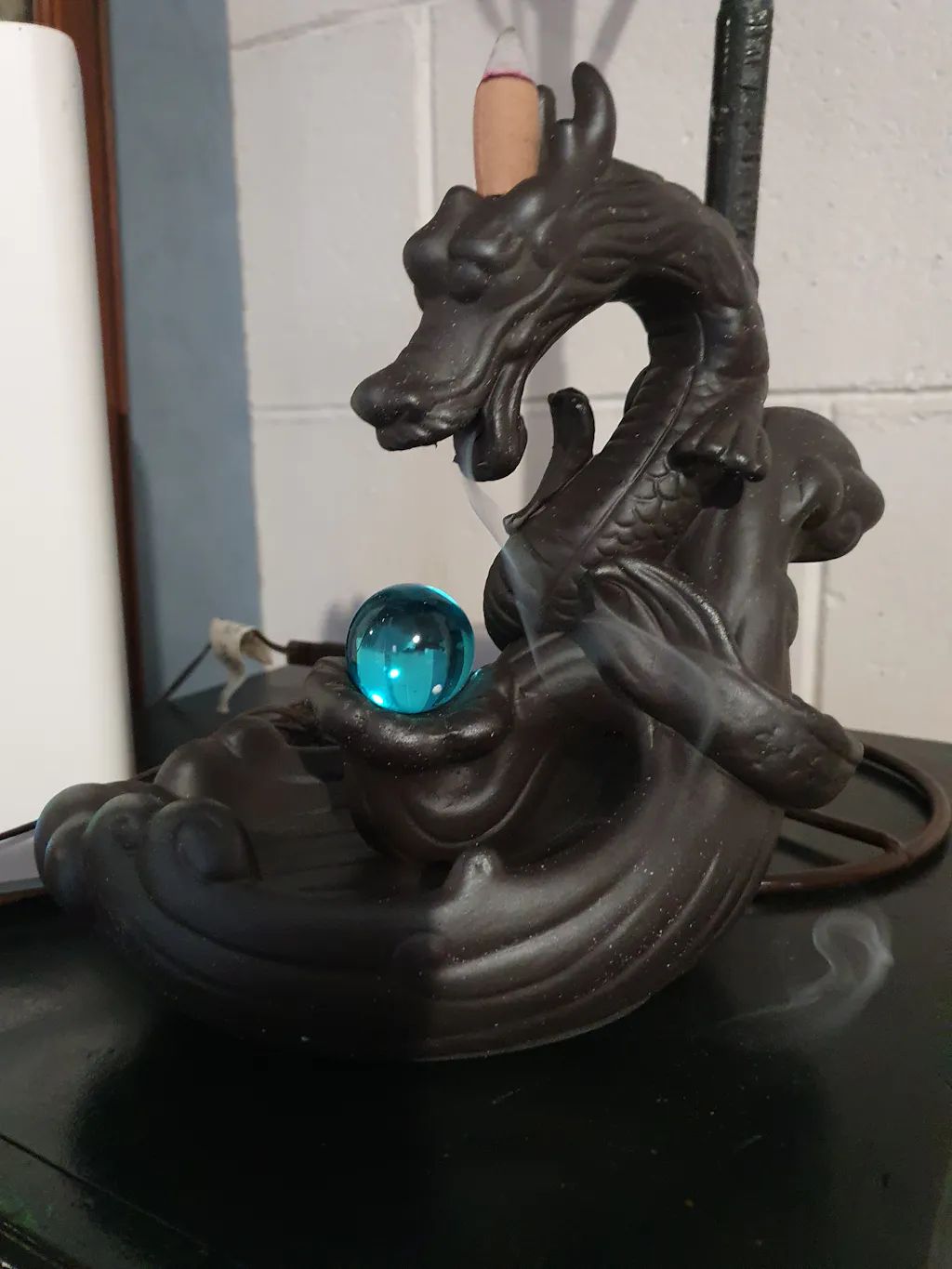 When the cone is lit the smoke from the cone cascades downwards from the dragon's mouth like smoke onto a crystal ball in a mesmerizing waterfall effect to pool at the bottom. Beautiful to watch.