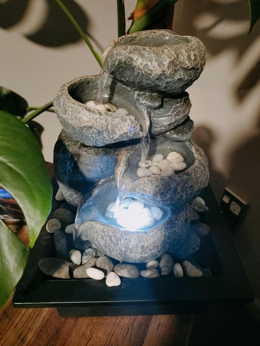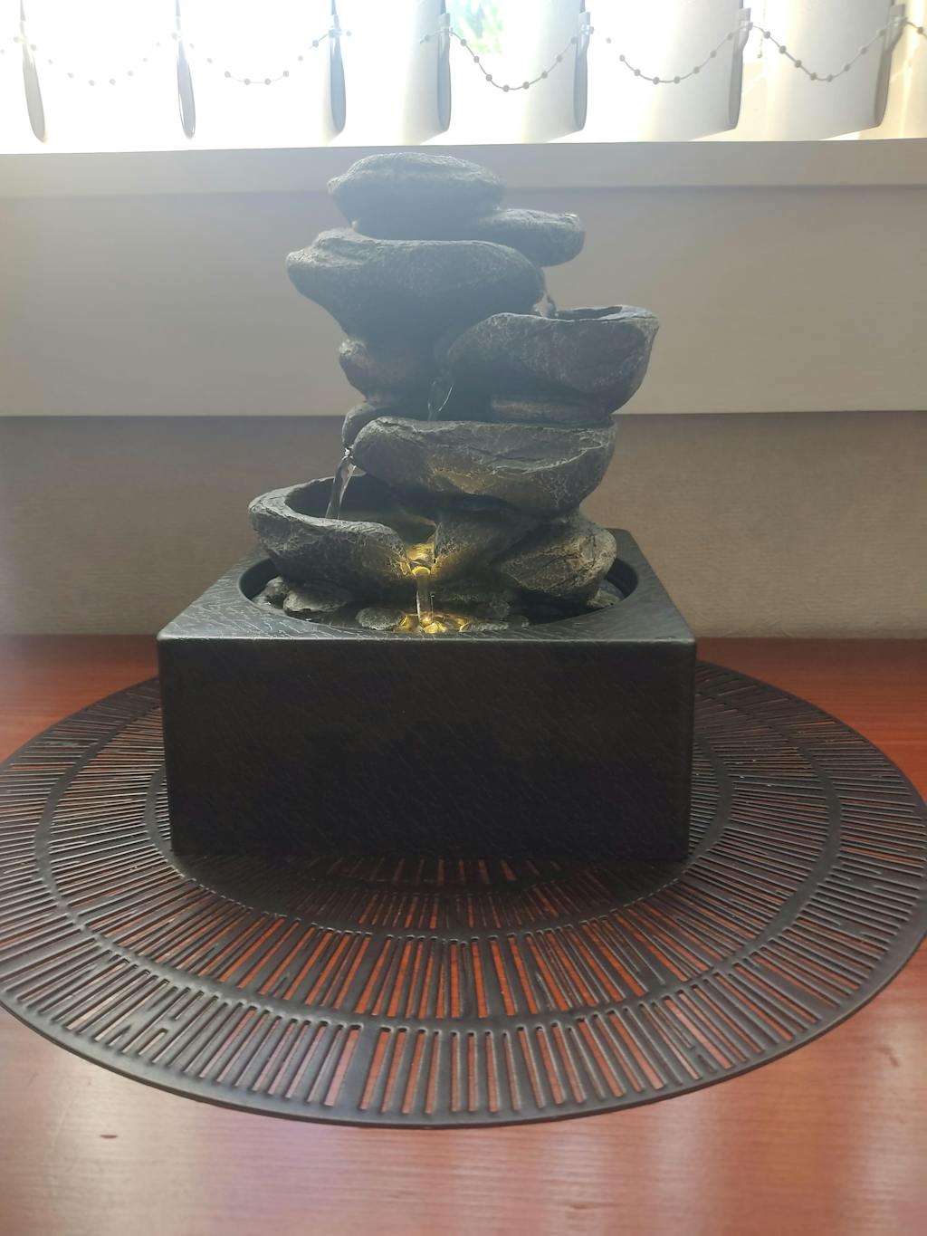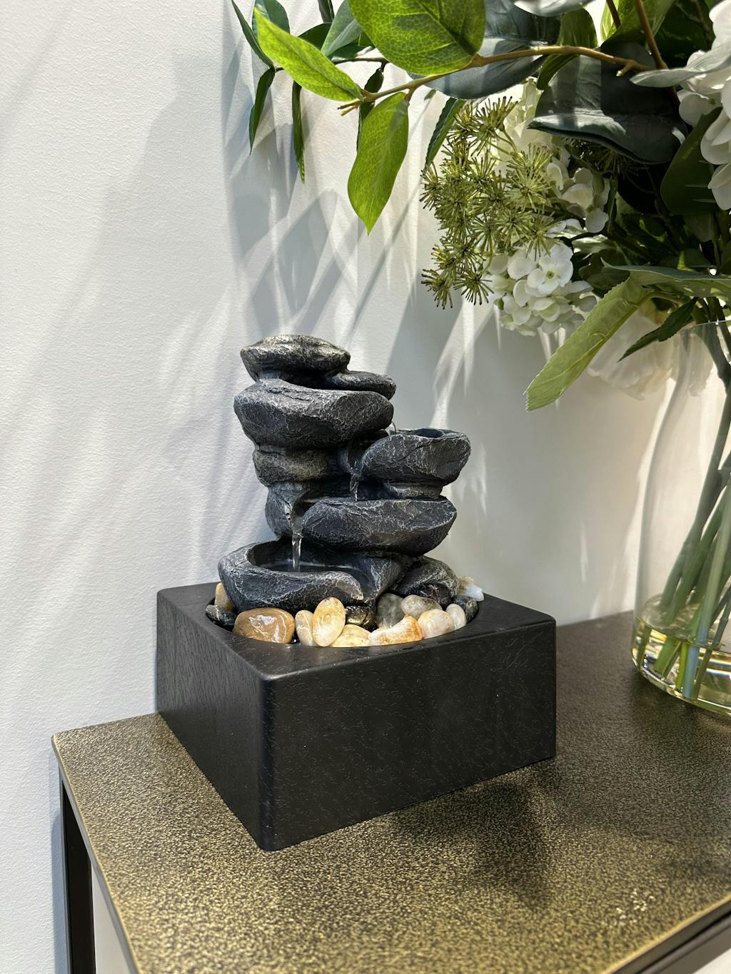 Featuring a Japanese-inspired three-tiered waterfall on a solid square base.